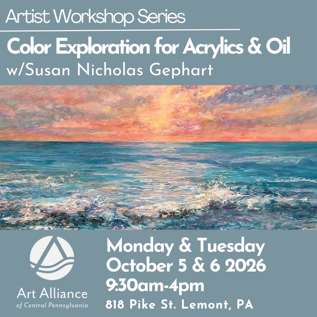 In this relaxed, upbeat workshop you will learn how to see the depth of color and create a unique and personally expressive landscape painting or (subject of your choice). The use of the color wheel will help support and guide your color mixing. Susan will begin each morning with a short inspirational demo designed to kick-start you into the creative spirit and aid in color expression.